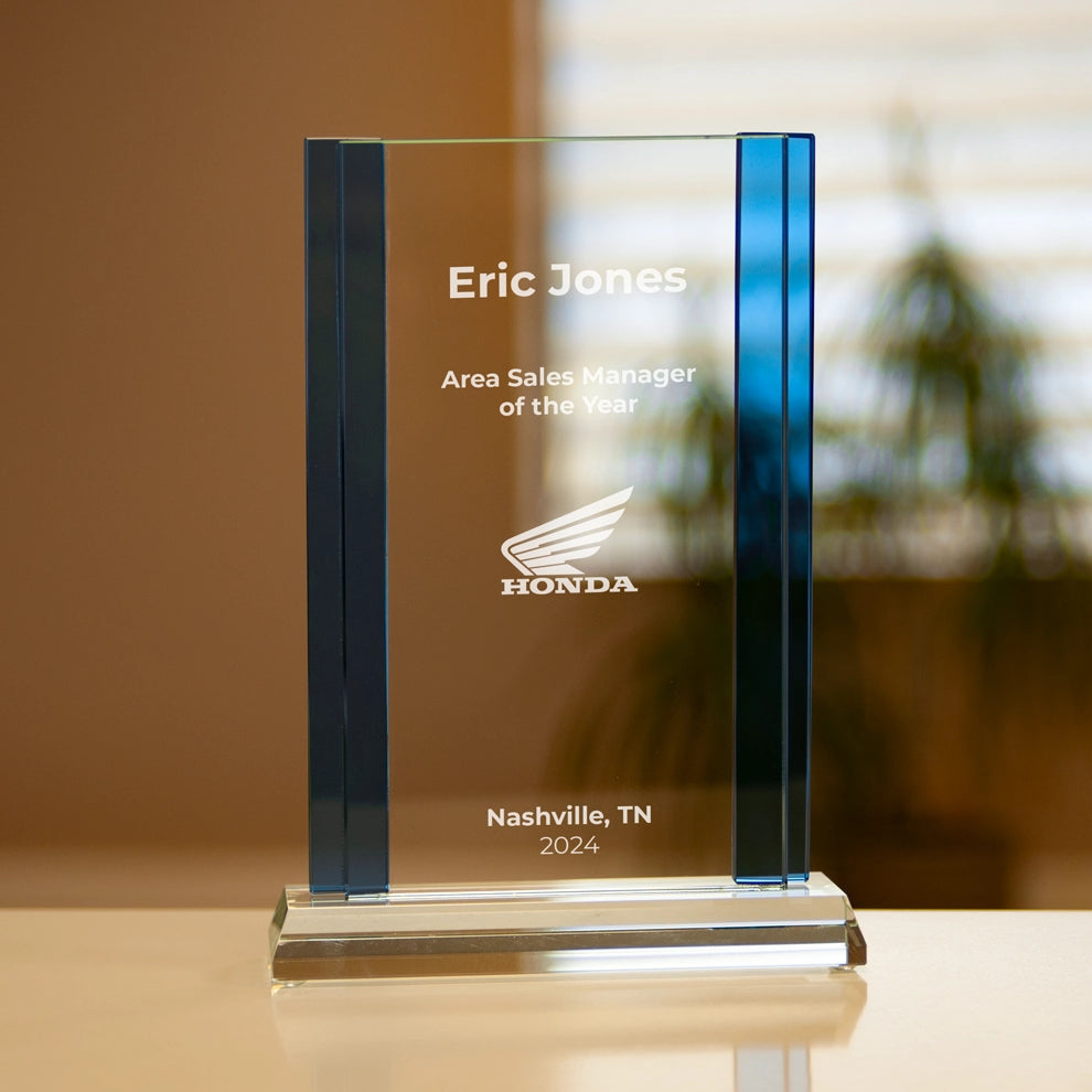 An elegant stylish glass plaque with blue accents.