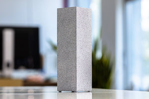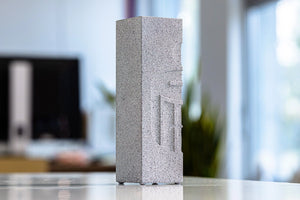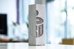 A crystal tower covered in special material to resemble a concrete block with deep sandblasting of logo.