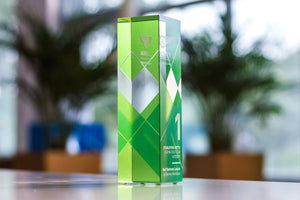 Modern, stylish and high tech looking crystal awards with a color gradient. We can print any combination of color gradients of your choice.