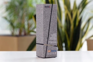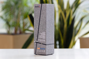 A crystal tower covered in special material to resemble a concrete block with deep sandblasting of logo.