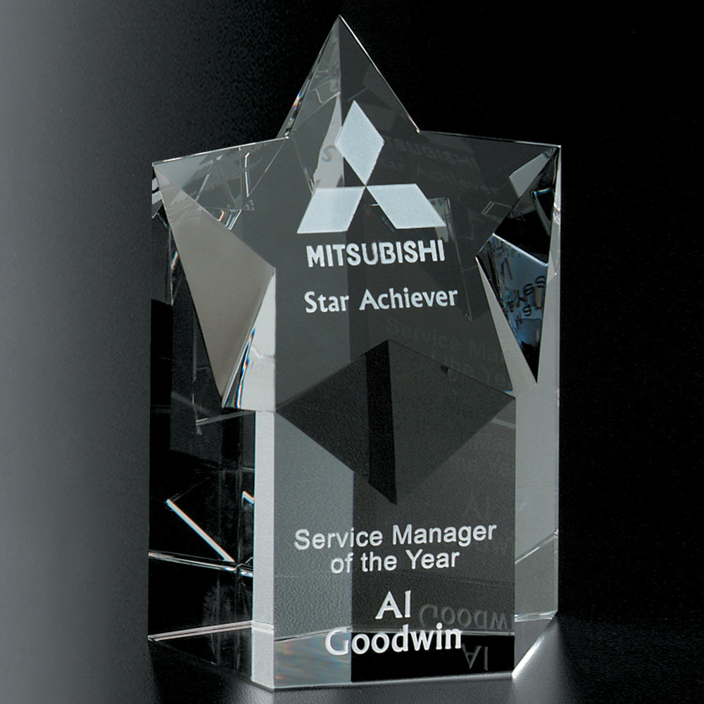 The crystal Mega Star award features a beautifully handcrafted optically perfect crystal pentagon with a faceted star on the top. The fantastic highlights make the Mega Star an eye-catching, sophisticated award.