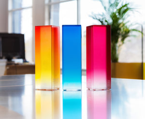 Modern, stylish and high tech looking crystal awards with a color gradient. We can print any combination of color gradients of your choice.