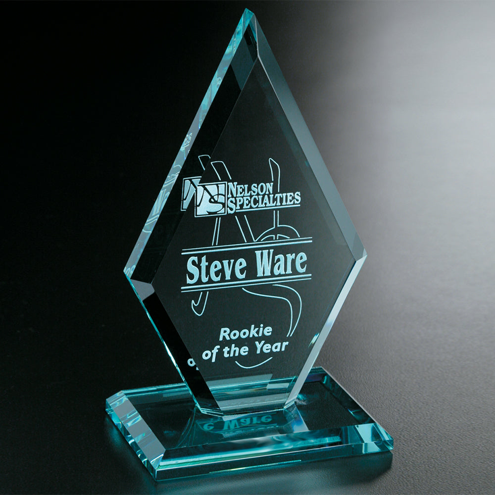The dramatic jade crystal Premier Diamond award made of hand-cut jade crystal with beveled edges, mounted on a beveled jade crystal base.